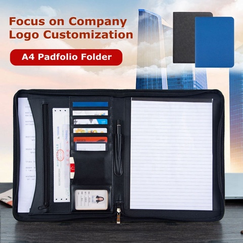 Preto Profissional Carteira De Couro De Negócios Para Homens, A4 Couro Almofada De Escrita Pasta Padfolio Com Zíper, LOGOTIPO Personalizado PU Padfolio