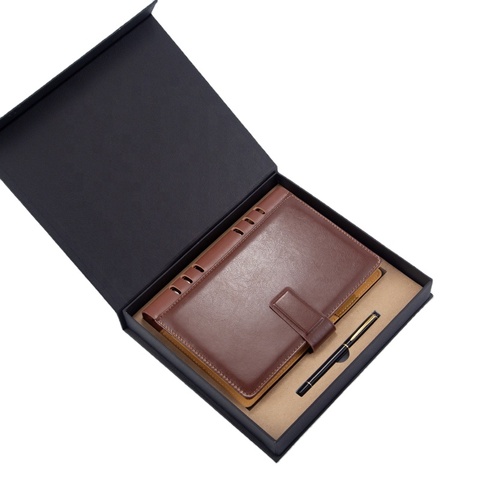 Caderno de couro encadernação planejador, jogo de presente para caderno, escritório, logotipo personalizado, encadernação de anel de negócios com caneta